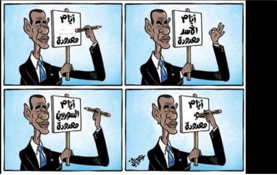 وتداول عدد من المواقع الإخبارية صورة توضح تطور تصريحات أوباما في ما يخص سوريا، من خلال إعلانه سابقا بأن أيام الأسد معدودة في سوريا، ثم تطور الأمر إلى أن أيام الشعب السوري أصبحت معدودة.
