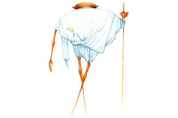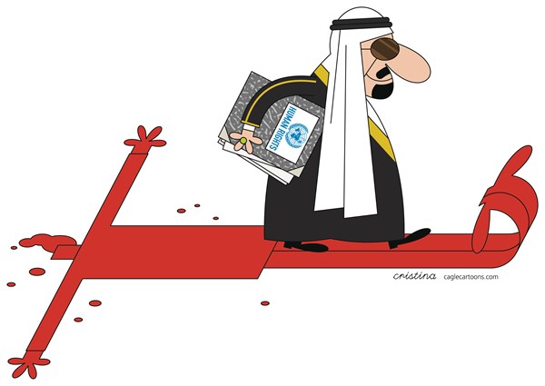 وقدمت الرسامة البرتغالية كريستينا سامبيو كاريكاتيرًا لملك السعودية يحمل ملف حقوق الإنسان “هيومان رايتس” ويسير على سجادة حمراء على شكل إنسان، مما يشير إلى الانتهاكات الحادثة في السعودية: