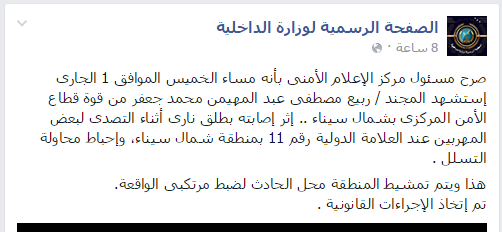 وأوضحت وزارة الداخلية، في بيان لها اليوم على صفحتها بموقع “فيسبوك” أن المجند “ربيع مصطفى عبد المهيمن محمد جعفر” قتل مساء الخميس، بطلق ناري أثناء تصديه لبعض المهربين عند العلامة الدولية رقم 11 بمنطقة شمال سيناء .