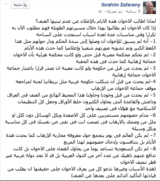 وأضاف الزعفراني -خلال منشور له عبر صفحته على موقع التواصل الاجتماعي “فيس بوك”-: “إذا كان الإخوان لم يطالبوا بهذا خلال مسيرتهم الطويلة فهو مطلوب منهم الآن تكرارًا، وفي مناسبات عدة، أن يعلنوا عدم تبنيهم للعنف؛ لعدة أسباب استجدَّت على الساحة”.