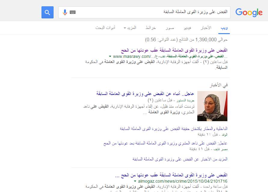 نشر ” موقع مصراوي” خبرًا عاجلاً منذ نحو ساعة أفاد خلاله بأن جهاز الرقابة الإدارية قام بالقبض على وزيرة القوى العاملة في الحكومة السابقة، ناهد العشري، عقب عودتها من أداء فريضة الحج بالأراضي المقدسة بالسعودية، مساء أمس السبت.