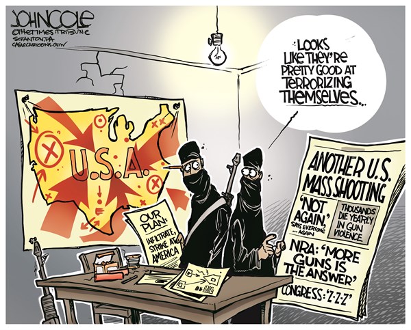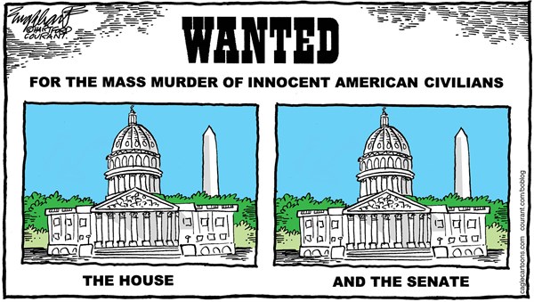 ونشرت صحيفتا “النيويورك تايمز” و”الواشنطن بوست” رسمتين، إحداهما للبيت الأبيض ومجلس الشيوخ الأميركي، تعلوهما كلمة “WANTED” للحساب على عمليات القتل الجماعي للمواطنين الأميركيين الأبرياء.