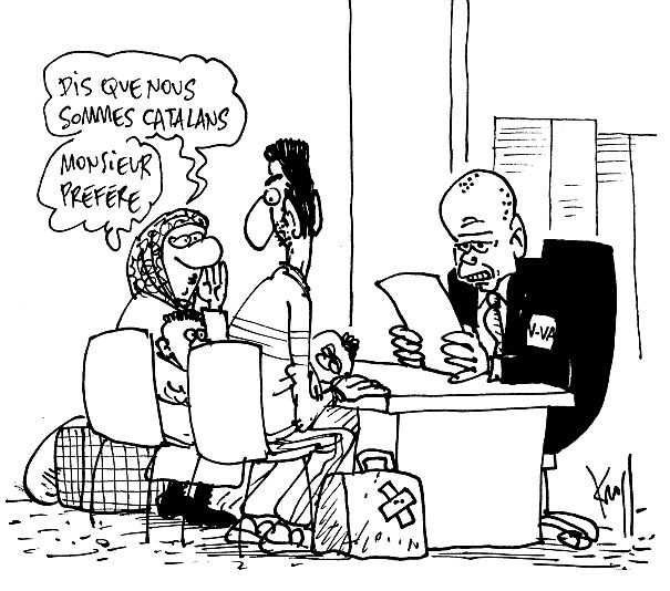 يظهر الكاريكاتير رجلا سوريا ومعه زوجته وابنه والحقائب التي تمكن من الفرار بها من بلاده، وهو يجلس أمام موظف ألماني ينظر في طلب لجوئهم حتى يتمكنوا من المعايشة هناك، وتقول امرأته “قل له إننا من كتالونيا” حتى يوافق الألمان، نسبة إلى مقاطعة كتالونيا التي تحارب من أجل انفصالها عن إسبانيا، في الوقت الذي اقترحت فيه ألمانيا ضم كتالونيا لها إداريا.