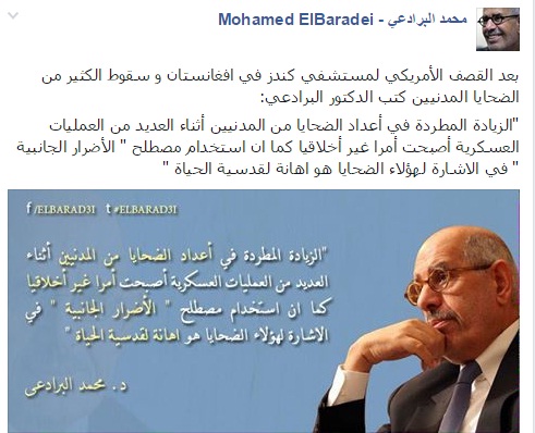 ونشرت الصفحة الرسمية لـ”البرادعي” على موقع “فيس بوك” تعليقه على القصف الأمريكي لمستشفى “كندز” في أفغانستان وسقوط الكثير من الضحايا المدنيين، حيث قال: “الزيادة في أعداد الضحايا من المدنيين أثناء العديد من العمليات العسكرية أصبحت أمرًا غير أخلاقيًا، كما أن استخدام مصطلح “الأضرار الجانبية” في الإشارة لهؤلاء الضحايا هو إهانة لقدسية الحياة”.