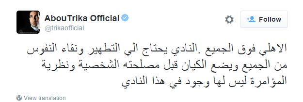 وكتب أبو تريكة -على حسابه الشخصي بموقع التواصل الاجتماعي “تويتر”-: “الأهلى فوق الجميع.. النادي يحتاج إلى التطهير ونقاء النفوس من الجميع ويضع الكيان قبل مصلحته الشخصية ونظرية المؤامرة ليس لها وجود في هذا النادي”.