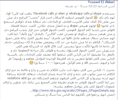 وقال أحد رواد فيس بوك -في منشور له- إنه تم غلق برنامج “سكايب” الذي يستخدمه، وعند اتصاله بالجهاز القومي لتنظيم الاتصالات أكدوا له صدور قرار بحجب هذه البرامج، وأن هذه البرامج ما زالت تعمل عند البعض؛ لأن القرار يتم تطبيقه تباعًا “أي على مراحل” .