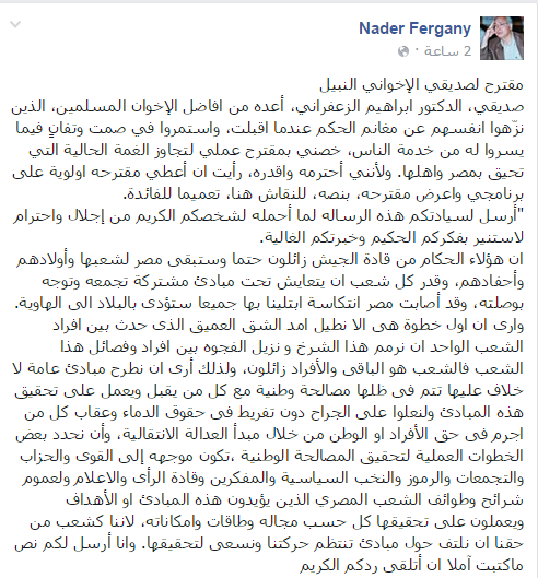 وقال “فرجاني” -في بداية منشوره- إن هذا “مقترح لصديقي الإخواني النبيل، الدكتور إبراهيم الزعفراني، أعده من أفاضل الإخوان المسلمين، الذين نزّهوا أنفسهم عن مغانم الحكم عندما أقبلت، واستمروا في صمت وتفانٍ فيما يسروا له من خدمة الناس، خصني بمقترح عملي لتجاوز الغمة الحالية التي تحيق بمصر وأهلها، ولأنني أحترمه وأقدره، رأيت أن أعطي مقترحه أولوية على برنامجي وأعرض مقترحه، بنصه، للنقاش هنا، تعميمًا للفائدة”.