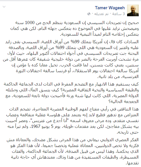 قال الكاتب الصحفي والناشط الاشتراكي، تامر وجيه، أن تصريحات عبد الفتاح السيسي، بأن “السعودية تشرف على تنظيم الحج منذ ألف عام، تعكس جهله وإخلاصه التام لمبدأ التبعية للسعودية”.