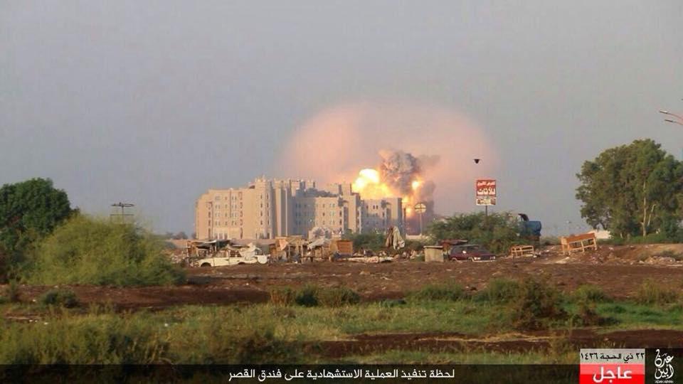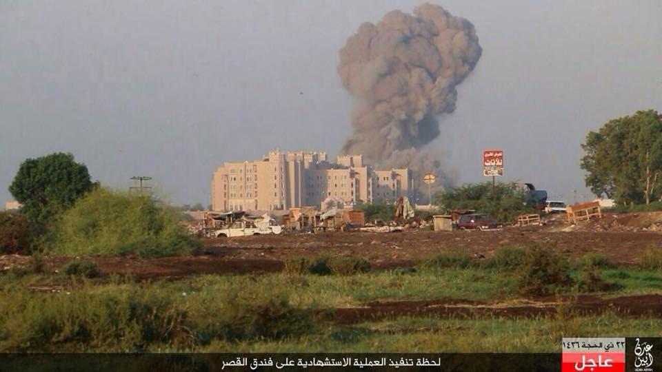أصدرت “ولاية عدن” التابعة لتنظيم “الدولة”، مساء الثلاثاء، بيانًا قالت فيه إن أربع عمليات استهدفت تجمعات لضباط سعوديين وإماراتيين اليوم؛ حيث استهدفت العملية الأولى “فندق القصر”، هو مقر الحكومة اليمنية بعدن، ونفذها “أبو سعد العدني” بشاحنة مفخخة، ثم تبعه “أبو محمد السهيلي”، بـ”همر” مفخخة.