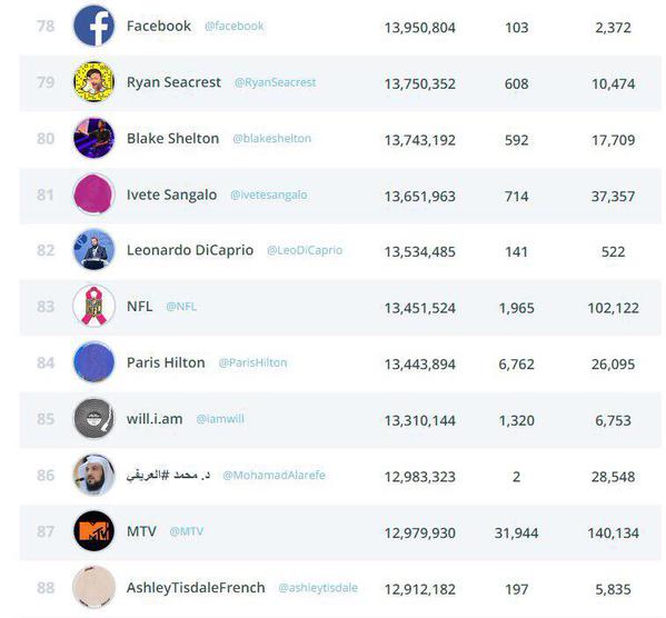 تصدّر الداعية الإسلامي السعودي، محمد العريفي، قائمة أكثر الحسابات متابعة عربيا على موقع التواصل الاجتماعي "تويتر"، والمرتبة الـ86 عالميًا، حيث وصل عدد المتابعين إلى 13 مليون متابع، وهو أكبر رقم للمتابعين عربيا