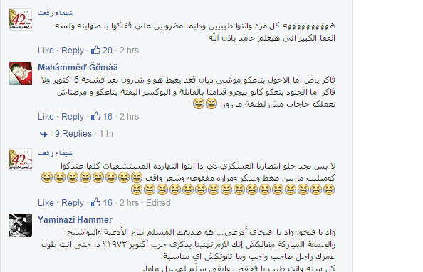 “إيه يا أفيخاي عامل من بنها أنت النهارده؟”، “إلا إنت فين يا أفيخاي النهارده.. مافيش كل سنة وأنتم طيبين”، “مافيش تهاني ولا مباركات ليه النهارده يا أفيخاي.. 6 أكتوبر مش بيفكرك بحاجة؟”، “كل سنة وإنتم راكعين تحت أقدام المصريين”، كانت هذه بعض العبارات والرسائل التي وجهها بعض رواد مواقع التواصل الاجتماعي عبر الصفحة الرسمية للمتحدث باسم جيش الاحتلال، أفيخاي أدرعي، في ذكرى انتصارات حرب أكتوبر.