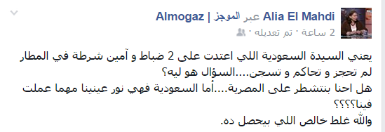 وقالت مستنكرة – عبر منشور لها في صفحتها الشخصية على “فيس بوك”- يعني السيدة السعودية اللي اعتدت على 2 ضباط وأمين شرطة في المطار لم تحجز وتحاكم وتسجن؟”.