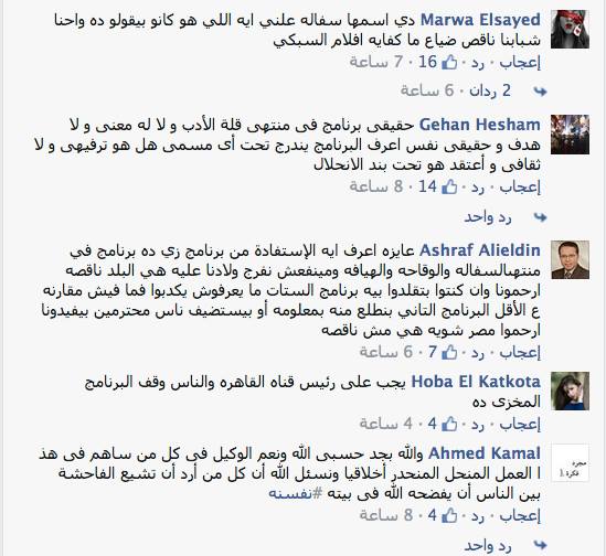وخرجت حملة على صفحة “القاهرة والناس” تعليقًا على البرنامج؛ حيث قال أحد رواد فيس بوك: “دي اسمها سفاله علني ايه اللي هو كانو بيقولو ده واحنا شبابنا ناقص ضياع ما كفايه افلام السبكي”.