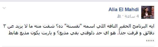 وقالت المهدي في منشور عبر صفحتهاعلى موقع التواصل الاجتماعي “فيس بوك”: “إيه البرنامج الحقير التافه اللي اسمه “نفسنة” ده؟ شفت منه ما لا يزيد عن ٣ دقائق و قرفت جدًا، متسائلة: “هو اي حد دلوقتي بقي مذيع؟ وي اريت يكون مذيع هابط”.