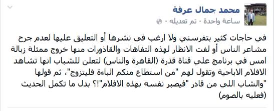 وأضاف عرفة خلال منشور له على موقع التواصل الاجتماعي “فيس بوك” أن المذيعة السابق ذكرها أعلنت للشباب أنها تشاهد الأفلام الإباحية وتقول لهم: “من استطاع منكم الباءة فليتزوج”، ثم قولها: “والشاب اللي من قادر “فيصبر نفسه بهذه الأفلام”!؟ بدل ما تكمل الحديث “فعليه بالصوم”.