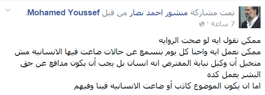 ويعلق Mohamed Youssef “ممكن تقول إيه لو صحت الرواية؟ ممكن نعمل ايه واحنا كل يوم بنسمع عن حالات ضاعت فيها الإنسانية؟ مش متخيل أن وكيل نيابة المفترض إنه انسان بل يجب أن يكون مدافع عن حق البشر يعمل كده، إما أن يكون الموضوع كاذب أو ضاعت الانسانيه فينا وفيهم”.