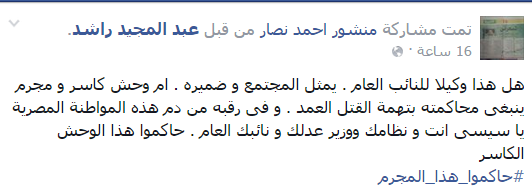 وتساءل عبد المجيد راشد: “هل هذا وكيل للنائب العام؟ يمثل المجتمع وضميره؟ أم وحش كاسر ومجرم ينبغي محاكمته بتهمة القتل العمد؟ وفي رقبه من دم هذه المواطنة المصرية يا سيسي انت ونظامك ووزير عدلك ونائبك العام، حاكموا هذا الوحش الكاسر”.
