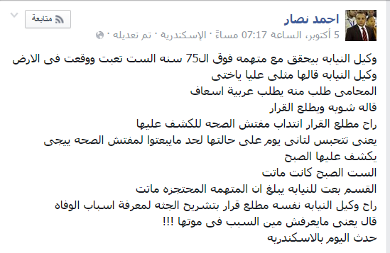 تداول مستخدمو موقع التواصل الاجتماعي “فيس بوك” قصة لمتهمة بالإسكندرية تبلغ من العمر 75 عامًا، توفيت أثناء التحقيق معها بعد أن تعنت وكيل النيابة في إحضار الطبيب لها.