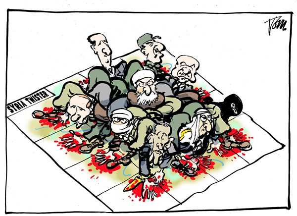فيما نشرت صحيفة “فاينينشال تايمز” رسمًا كاريكاتيريًا تحت عنوان “SYRIA TWISTER” يجسد أطراف الأزمة السورية (بوتين وأوباما وخامنئي والتحالف والخليج وداعش وغيرهم..)