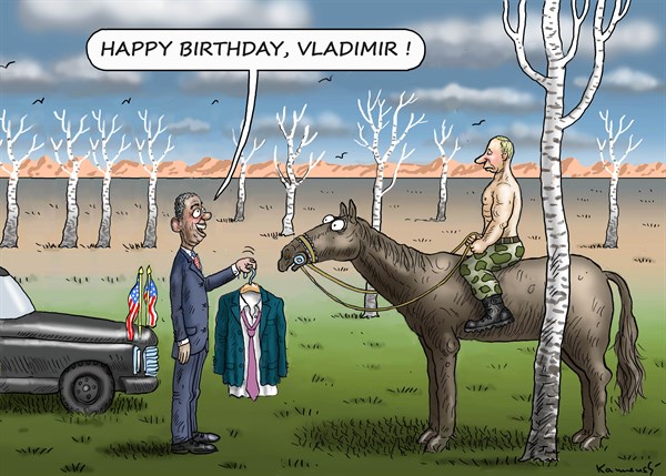 واحتفالاً بعيد ميلاد الرئيس الروسي فلاديمير بوتين، أعادت الرسامة السلوفاكية ماريان كمينيسكي رسم صورة شهيرة لبوتين يمتطي جواد بينما يقابله الرئيس الأميركي أوباما مهنئا بعيد ميلاده.