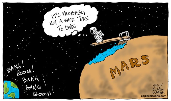 فيما اتجه موقع كاجل نحو اكتشاف المياه على سطح كوكب المريخ، فنشرت كاريكاتير لرائد فضاء يستعد للغطس بينما كوكب الأرض يصدر أصوات الفرقعات الناجمة عن الحروب والصراعات.