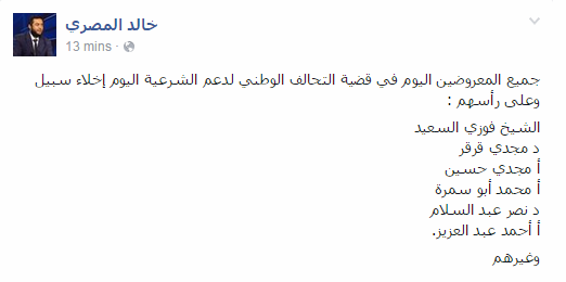 وكتب المصري، في منشور له عبر صفحته الرسمية على موقع “فيس بوك”: “ويأتي على رأس الحاصلين على إخلاء سبيل الشيخ فوزي السعيد، ود.مجدي قرقر، وأ.مجدي حسين، وأ.محمد أبو سمرة، ود.نصر عبد السلام، وأ.أحمد عبد العزيز، وغيرهم”.