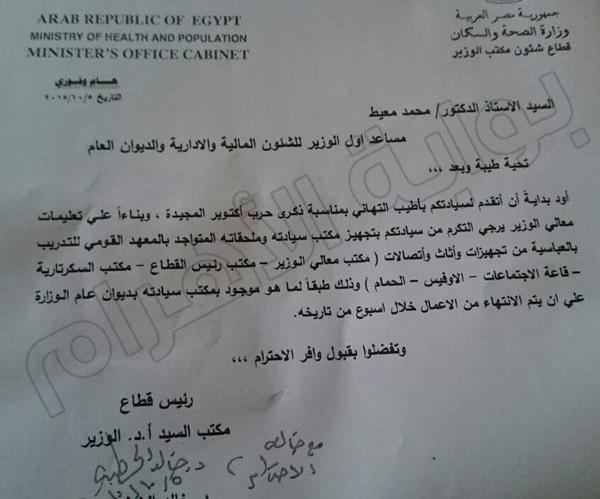 والأخطر من ذلك، فقد طالب رئيس قطاع مكتب وزير الصحة، الدكتور خالد الخطيب، من الدكتور محمد معيط، مساعد أول وزير المالية، بتجهيز مكتب لوزير الصحة بالمعهد القومي للتدريب يشمل “الأثاث والاتصالات ومكتب لرئيس القطاع، السكرتارية، وقاعة اجتماعات، والأوفيس، والحمام”، وهذا لمدة أسبوع مما يعد إهدارًا آخر للمال العام، بحسب “بوابة الأهرام”.