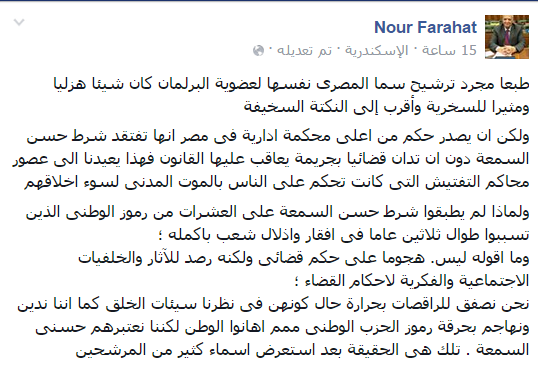 وأكد “فرحات” أن ما قاله “ليس هجومًا على حكم قضائي، ولكنه رصد للآثار والخلفيات الاجتماعية والفكرية لأحكام القضاء”، مضيفًا “نحن نصفق للراقصات بحرارة حال كونهن في نظرنا سيئات الخلق كما أننا ندين ونهاجم بحرقة رموز الحزب الوطني ممن أهانوا الوطن لكننا نعتبرهم حسني السمعة، تلك هي الحقيقة بعد استعرض أسماء كثيرة من المرشحين”.