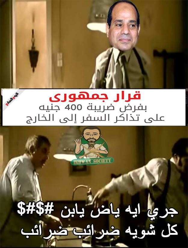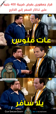 شهدت مواقع التواصل الإجتماعي موجة من التعليقات الساخرة من قرار عبدالفتاح السيسي بفرض ضريبة علي تذاكر السفربواقع 400 جنية، كما دشن نشطاء هشتاج #أفرض_ضرائب_كأنك_السيسي للسخرية من الضرائب التي يفرضها السيسي.