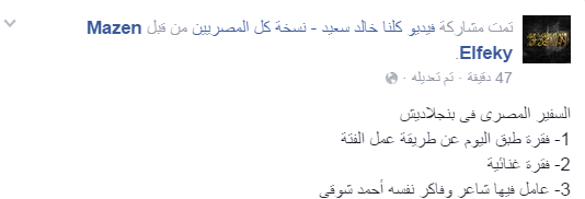 وعلق مازن الفقي: “السفير المصري في بنجلاديش 1- فقرة طبق اليوم عن طريقة عمل الفتة 2- فقرة غنائية 3- عامل فيها شاعر وفاكر نفسه أحمد شوقي”.