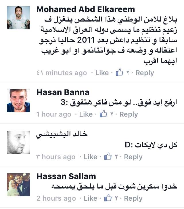 – محمد عبد الكريم: “بلاغ للأمن الوطني هذا الشخص يتغزل في زعيم تنظيم ما يسمى دولة العراق الإسلامية سابقًا، نرجو اعتقاله ووضعه في جوانتانمو أو أبو غريب أيهما أقرب”.