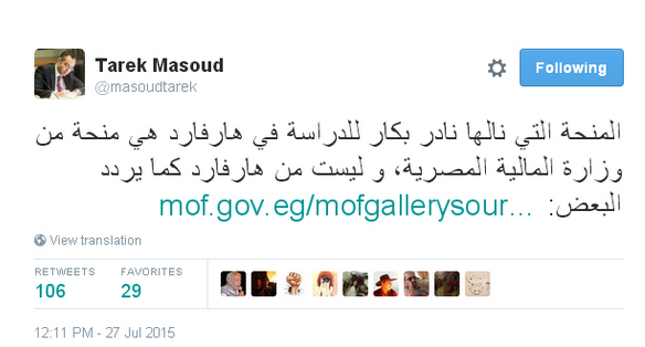وأكد الدكتور طارق مسعود، الأستاذ المشارك في كلية هارفارد، أن المنحة التي حصل عليها القيادي الشاب بحزب النور السلفي “نادر بكار” للدراسة بجامعة هارفارد هي منحة من وزارة المالية المصرية وليست من جامعة هارفارد كما أشاعت وسائل الإعلام المصرية.