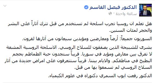 وأشار -عبر منشور له على “فيس بوك”- إلى أن السوريين جميعًا أرضًا ومعارضين ومؤيدين سيعانون من آثار تلك الأسلحة لقرون، مضيفًا أن الأسلحة الروسية المشعة لا تفرق بين معارض ومؤيد في سوريا.