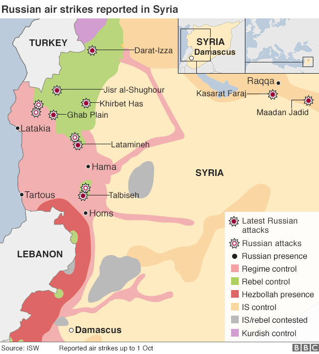 استهل المقال بالإشارة إلى “الدعم الجوي الذي قدمته طائرات الميج الروسية للمرة الأولى، يوم الأربعاء الماضي، للجيش السوري بموازاة هجومه على المتمردين شمال حمص، ومواصلة الروس ضرباتهم الجوية ضد محافظة إدلب التي يسيطر عليها المتمردون. وإطلاقهم للمرة الأولى صواريخ كروز من سفن حربية في بحر قزوين ضد أهداف تابعة للمتمردين، وخلال الأيام العشرة الماضية، أصبحت الإستراتيجية الروسية في سوريا واضحة”.