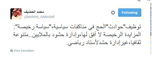 استنكر إعلاميون سعوديون الهجوم على المملكة؛ فندد الإعلامي السعودي محمد الحضيف بتوظيف حوادث الحج سياسيًا، واصفًا ذلك بـ”السياسة الرخيصة”، وقال في تغريدة عبر حسابه على موقع “تويتر”: “توظيف حوادث الحج في مناكفات سياسية “سياسة رخيصة”.