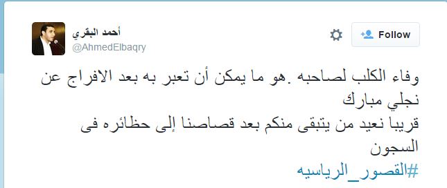 وقال أحمد البقري: “وفاء الكلب لصاحبه.. هو ما يمكن أن تعبر به بعد الإفراج عن نجلي مبارك.. قريبًا نعيد من يتبقى منكم بعد قصاصنا إلى حظائره في السجون”.