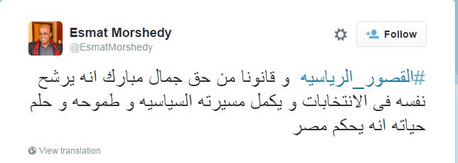 وقال Esmat Morshedy: “إن من حق جمال مبارك قانونًا أن يرشح نفسه في الانتخابات ويكمل مسيرته السياسية وطموحه وحلم حياته أن يحكم مصر”.