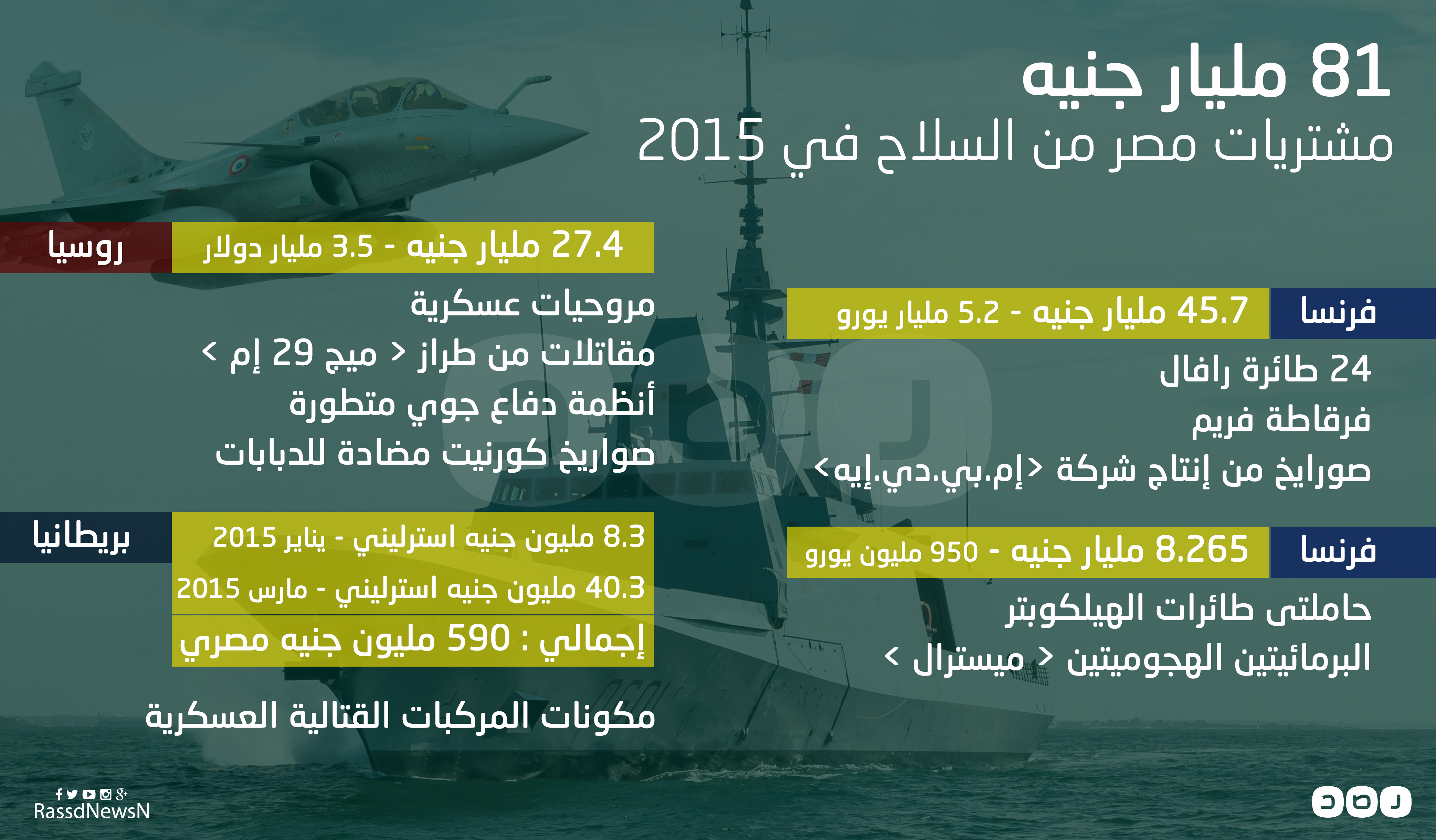 في ظل حرص مصر على تنويع مصادر السلاح وكذلك تنويع السلاح نفسه، عقد عبد الفتاح السيسي عديدا من الصفقات العسكرية التي بلغت في جملتها 81 مليار جنيه، ونستعرض خلال الإنفوجراف التالي مشتريات مصر من السلاح خلال عام 2015.