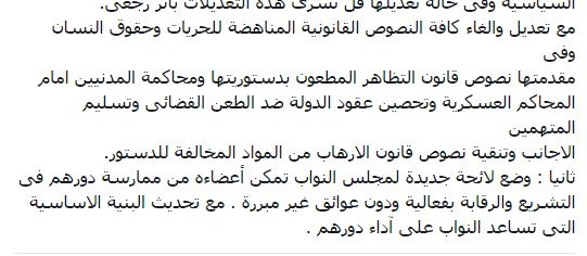ويشير إلى أن نواب قائمة “صحوة مصر”، ترى الإبقاء على القوانين المتعلقة بترتيبات المرحلة الانتقالية مثل؛ قانون الانتخابات الرئاسية ومجلس النواب وتقسيم الدوائر ومباشرة الحقوق السياسية، وفي حالة تعديلها فلن تسري هذه التعديلات بأثر رجعي.. كذلك تعديل وإلغاء كل النصوص القانونية المناهضة للحريات وحقوق الإنسان، وفي مقدمتها نصوص قانون التظاهر المطعون بدستوريتها ومحاكمة المدنيين أمام المحاكم العسكرية، وتحصين عقود الدولة ضد الطعن القضائي وتسليم المتهمين الأجانب وتنقية نصوص قانون الإرهاب من المواد المخالفة للدستور.