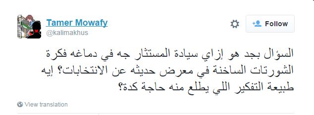 وتساءلTamer Mowafy : “السؤال بجد هو إزاي سيادة المستثار جه في دماغه فكرة الشورتات الساخنة في معرض حديثه عن الانتخابات؟ إيه طبيعة التفكير اللي يطلع منه حاجة كده؟”.