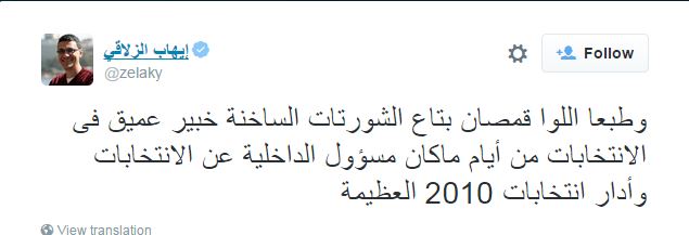 وعلق إيهاب الزلاقي قائلًا: “وطبعًا اللوا قمصان بتاع الشورتات الساخنة خبير عميق في الانتخابات من أيام ماكان مسؤول الداخلية عن الانتخابات وأدار انتخابات 2010 العظيمة”.