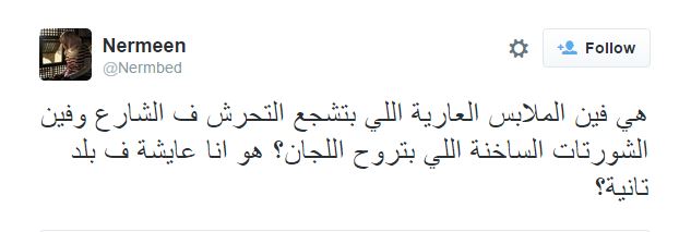 وتساءلتNermeen  مندهشة: “هي فين الملابس العارية اللي بتشجع التحرش في الشارع وفين الشورتات الساخنة؟، هو انا عايشة ف بلد تانية؟”.