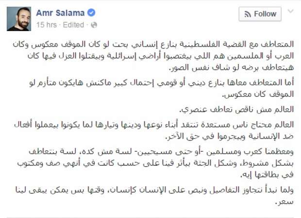 وقال”سلامة” -عبر “فيس بوك”-: “إن المتعاطف مع القضية الفلسطينية بنازع إنساني بحت، لو كان الموقف معكوسًا، وكان العرب أو المسلمون هم اللي بيغتصبوا أراضي إسرائيلية وبيقتلوا العزل فيها كان هيتعاطف برضه لو شاف نفس الصور؟”.