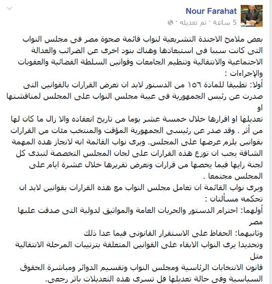 نشر نور فرحات، أستاذ القانون بجامعة الزقازيق وأحد المرشحين على قائمة “صحوة مصر” قبل أن تعلن انسحابها، بعض ملامح الأجندة التشريعية لنواب القائمة، والتي أكد أنها كانت سببًا في استبعادها.