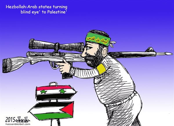 وفي سخرية من حزب الله يصوّب أعينه تجاه القدس بينما فوهات بنادقة باتجاه سوريا: