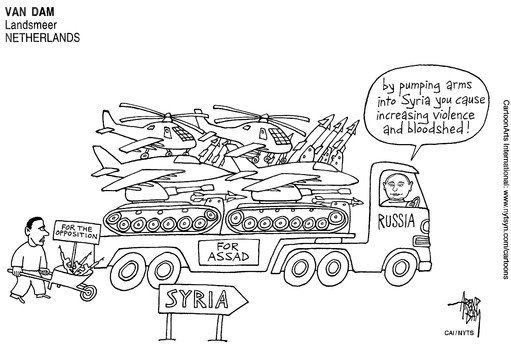 ففي الشأن السوري الروسي الأميركي عرضت “التايمز” هذا الرسم ساخرة من ادعاءات بوتن في مواجهة أوباما برغبته في حقن الدماء السورية في الوقت الذي يرسل فيها جيوشه للقتال لدى بشار.