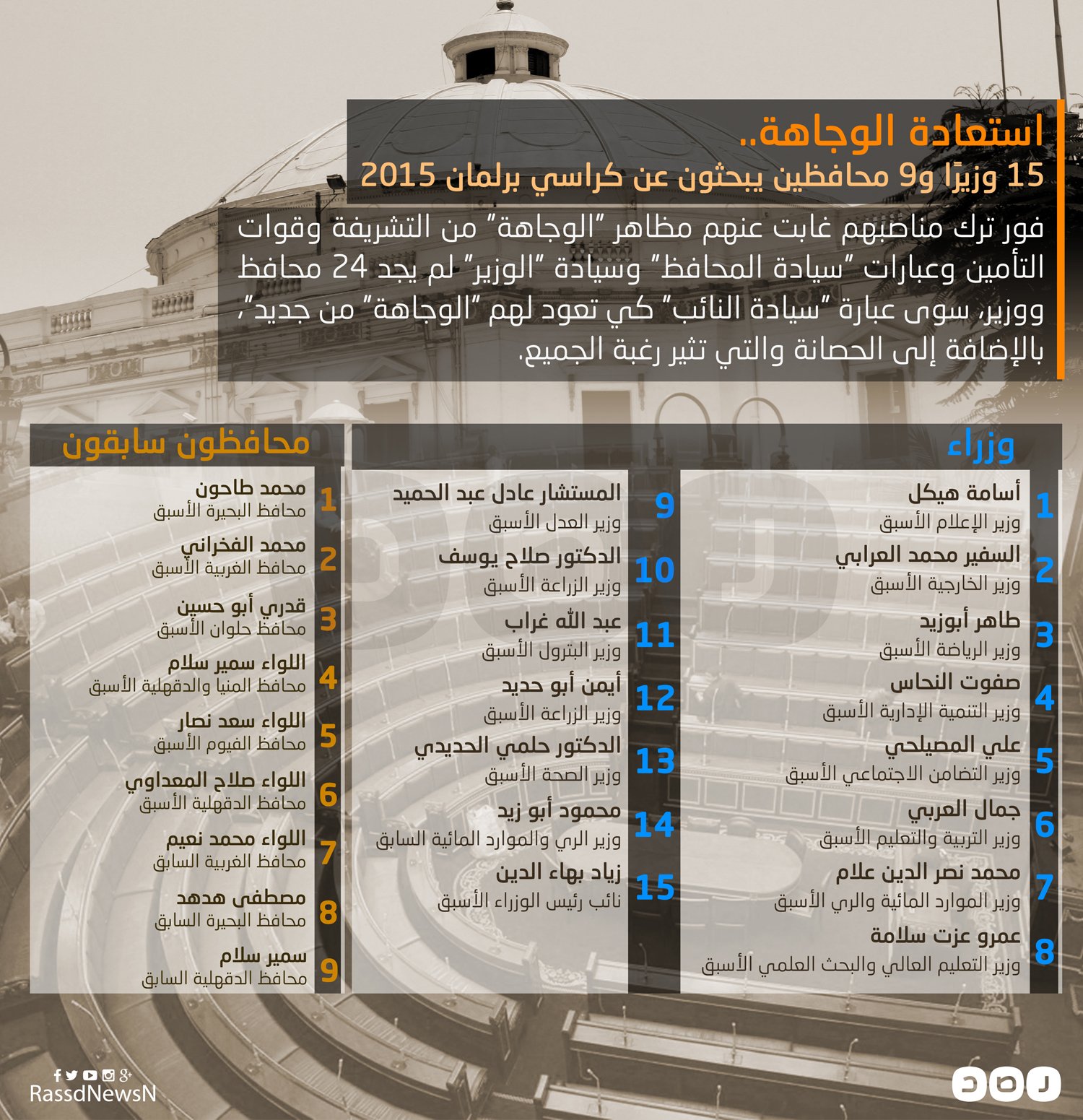 تستعرض “رصد” عددًا من الوزراء السابقين والمحافظين، الذين قرروا خوض الانتخابات البرلمانية، سواءً من خلال قوائم انتخابية أو على المقاعد الفردي: