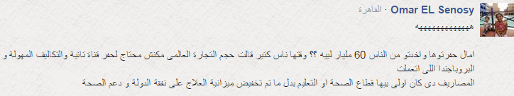 وسخر Omar EL Senosy قائلا: “أمال حفرتوها وأخدتم من الناس 60 مليار ليه؟ وقتها ناس كتير قالت حجم التجارة العالمي ماكانش محتاج لحفر قناة تانية والتكاليف المهولة والبروباجندا اللي اتعملت.. المصاريف دي كان أولى بيها قطاع الصحة أو التعليم بدل ما تم تخفيض ميزانية العلاج على نفقة الدولة ودعم الصحة”.