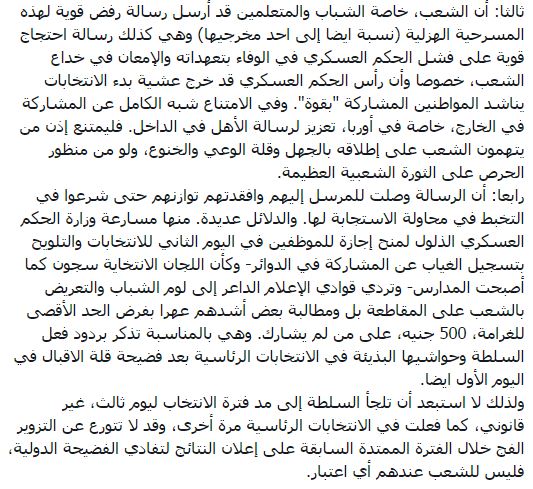 الرابع، أن الرسالة وصلت للمرسل إليهم وأفقدتهم توازنهم حتى شرعوا في التخبط في محاولة الاستجابة لها، والدلائل عديدة، منها مسارعة وزارة الحكم العسكري الذلول لمنح إجازة للموظفين في اليوم الثاني للانتخابات والتلويح بتسجيل الغياب عن المشاركة في الدوائر، وتردي قوادي الإعلام الداعر إلى لوم الشباب والتعريض بالشعب على المقاطعة بل مطالبة بعض أشدهم عهرًا بفرض الحد الأقصى للغرامة، 500 جنيه، على من لم يشارك”.