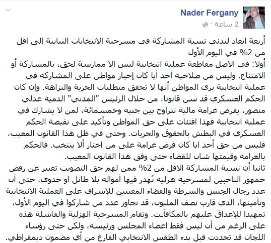 وقال -في منشور له على “فيس بوك”-: أولًا، الشعب، خاصة الشباب والمتعلمين، قد أرسل رسالة رفض قوية لهذه “المسرحية الهزلية”؛ احتجاجًا على فشل الحكم العسكري في الوفاء بتعهداته والإمعان في خداع الشعب، خصوصًا وأن رأس الحكم العسكري قد خرج عشية بدء الانتخابات يناشد المواطنين المشاركة “بقوة”.
